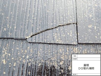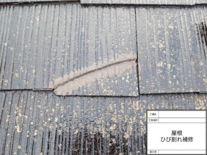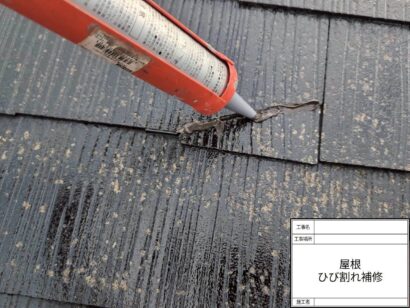 屋根にひび割れしている箇所があったので、コーキング剤を注入して補修します。