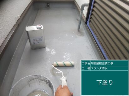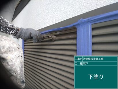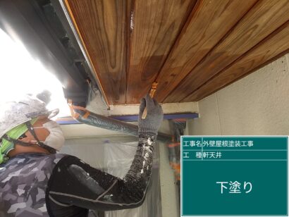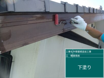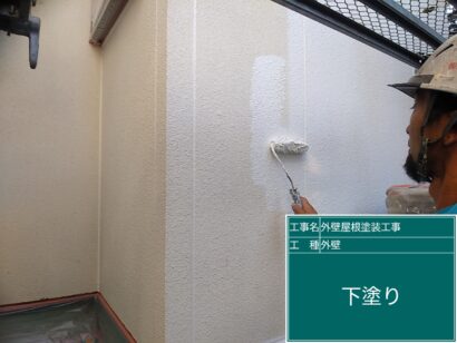 塗装の作業に入っていきます。外壁屋根は3回塗りが基本です。まずは、接着剤の役目がある下塗り剤をしっかり塗っていきます。