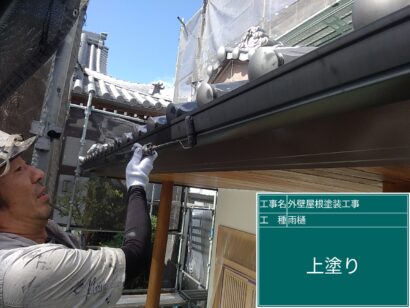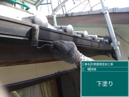 雨といは塩化ビニール素材が多く基本2回塗りをします。しっかり目粗ししてから塗装していきます。