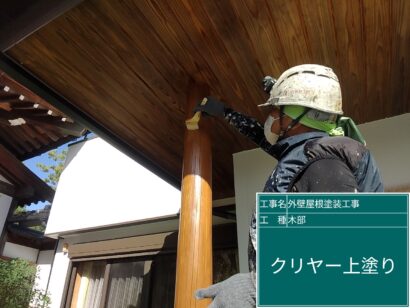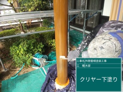 玄関前の柱は色を調整した後、クリヤー塗装で仕上げます。