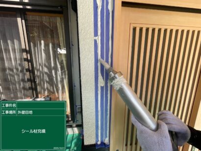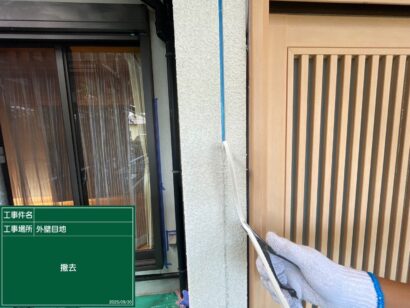 目地のシーリングが劣化しているとそこから雨水が浸入し、カビやサビが発生したりボードが反り返ったりと、お家の寿命に大きくかかわります。そこで傷んだ元のシーリング材を撤去し、新しく打ち替える作業をしていきます。まず、古い目地を撤去します。