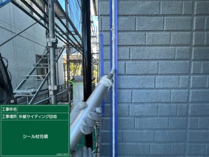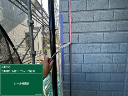 目地のシーリングが劣化しているとそこから雨水が浸入し、カビやサビが発生したりボードが反り返ったりと、お家の寿命に大きくかかわります。そこで傷んだ元のシーリング材を撤去し、新しく打ち替える作業をしていきます。まず、古い目地を撤去します。