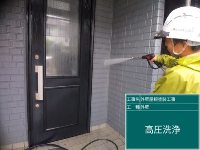 外壁を丁寧に高圧洗浄して汚れを落としていきます。