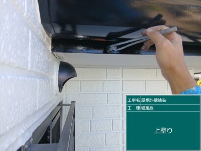 上塗りで仕上げます。新しい外壁や屋根の色に合って、きれいになりました!