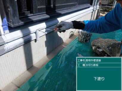 塗装の作業に入っていきます。外壁屋根は3回塗りが基本です。まずは、接着剤の役目がある下塗り剤をしっかり塗っていきます。
