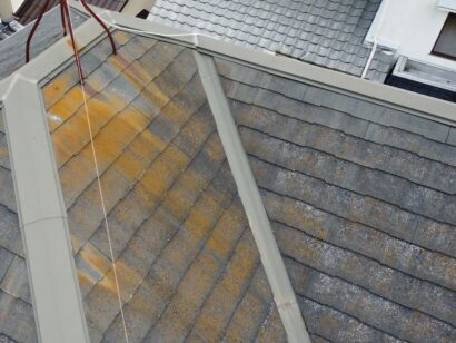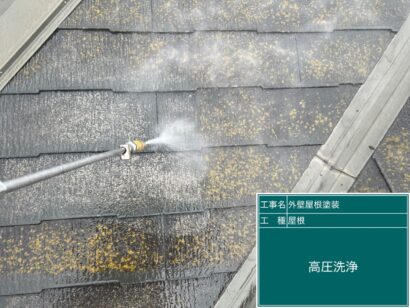 屋根も外壁と同様、高圧洗浄できれいにしていきます。水が飛散するので、周囲にも気を配りながら作業します。