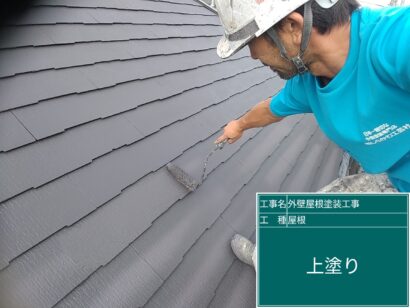 上塗りで仕上げます。新しい外壁や屋根の色に合って、きれいになりました!