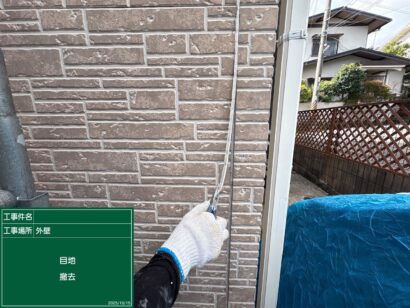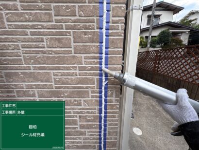 目地のシーリングが劣化しているとそこから雨水が浸入し、カビやサビが発生したりボードが反り返ったりと、お家の寿命に大きくかかわります。そこで傷んだ元のシーリング材を撤去し、新しく打ち替える作業をしていきます。まず、古い目地を撤去します。