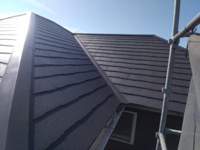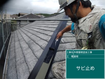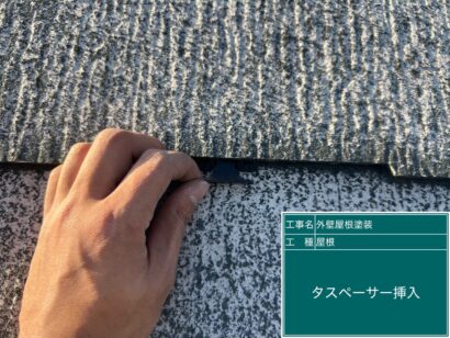 屋根にタスペーサーを挿入しているところです。塗料が瓦の継ぎ目につまって通気性が確保できなくなるのを防ぎます。しっかりと押し込んで、タスペーサーの取り付けは完了です。