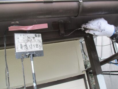 塗装の作業に入っていきます。外壁屋根は3回塗りが基本です。まずは、接着剤の役目がある下塗り剤をしっかり塗っていきます。