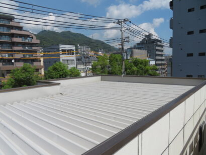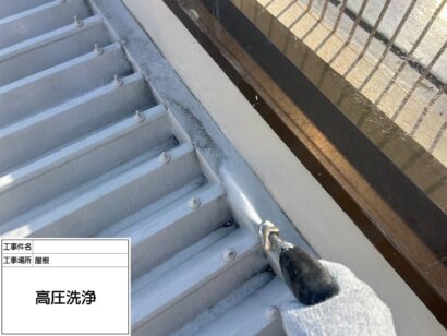屋根も外壁と同様、高圧洗浄できれいにしていきます。水が飛散するので、周囲にも気を配りながら作業します。