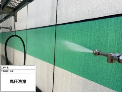 外壁を丁寧に高圧洗浄して汚れを落としていきます。
