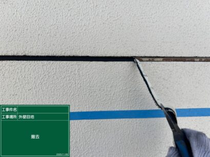目地のシーリングが劣化しているとそこから雨水が浸入し、カビやサビが発生したりボードが反り返ったりと、お家の寿命に大きくかかわります。そこで傷んだ元のシーリング材を撤去し、新しく打ち替える作業をしていきます。まず、古い目地を撤去します。