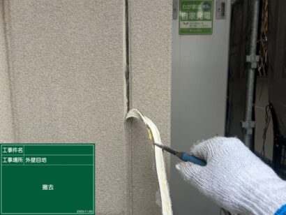 目地のシーリングが劣化しているとそこから雨水が浸入し、カビやサビが発生したりボードが反り返ったりと、お家の寿命に大きくかかわります。そこで傷んだ元のシーリング材を撤去し、新しく打ち替える作業をしていきます。まず、古い目地を撤去します。