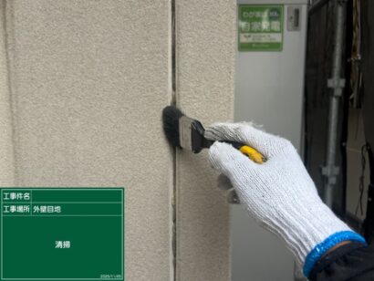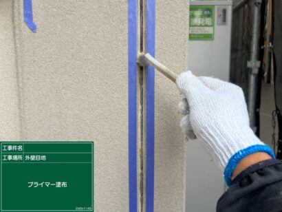 プライマーを塗っていきます。これによって、シーリング材の密着がよくなるので欠かせない作業です。