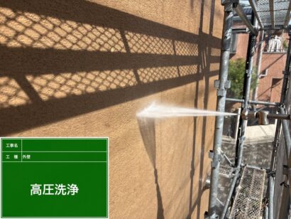 外壁を丁寧に高圧洗浄して汚れを落としていきます。