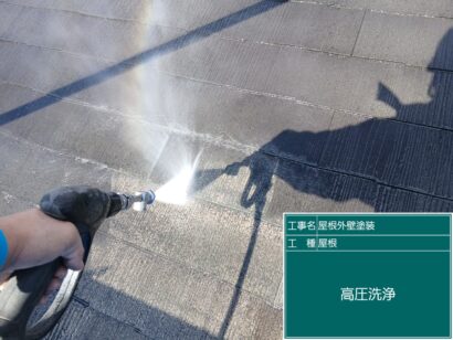 屋根も外壁と同様、高圧洗浄できれいにしていきます。水が飛散するので、周囲にも気を配りながら作業します。