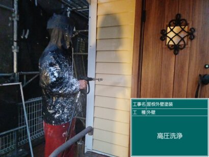 外壁を丁寧に高圧洗浄して汚れを落としていきます。