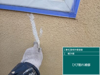 外壁や屋根にひび割れしている箇所があったので、コーキング剤を注入して補修します。