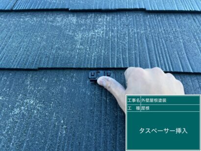 屋根にタスペーサーを挿入しているところです。塗料が瓦の継ぎ目につまって通気性が確保できなくなるのを防ぎます。しっかりと押し込んで、タスペーサーの取り付けは完了です。