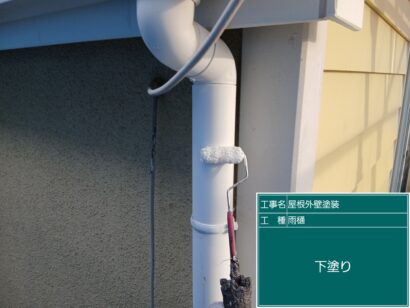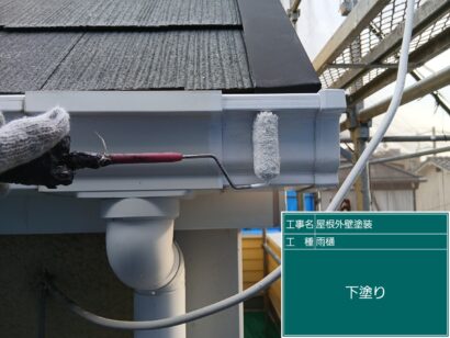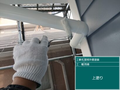 雨といは横雨といと縦雨といがあり、塩化ビニール素材が多く基本2回塗りをします。しっかり目粗ししてから塗装していきます。