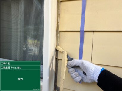 目地のシーリングが劣化しているとそこから雨水が浸入し、カビやサビが発生したりボードが反り返ったりと、お家の寿命に大きくかかわります。そこで傷んだ元のシーリング材を撤去し、新しく打ち替える作業をしていきます。まず、古い目地を撤去します。