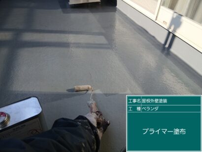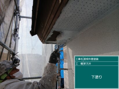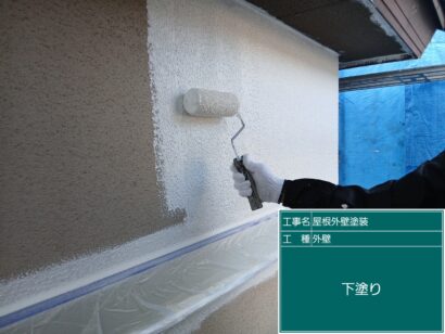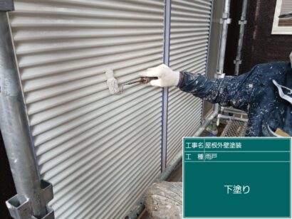 塗装の作業に入っていきます。外壁屋根は3回塗りが基本です。まずは、接着剤の役目がある下塗り剤をしっかり塗っていきます。