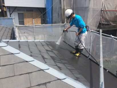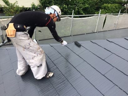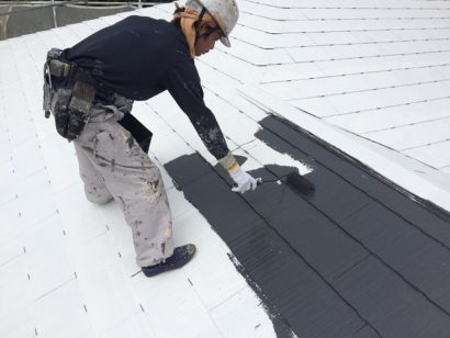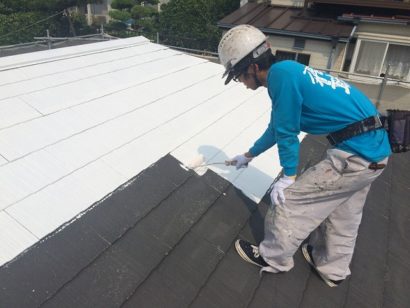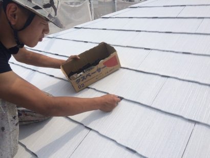 屋根も外壁と同様 たっぷりと下塗り剤を塗っていきます。 下塗りを終えた屋根は 真っ白で 雪山のよう。。。 照り返しがものすごいんです!
