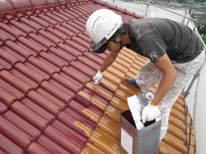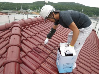 上塗りまで終えた屋根は 太陽の光を浴びて