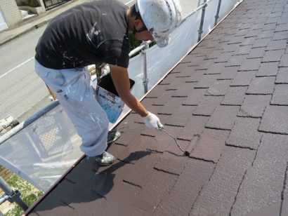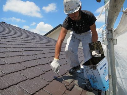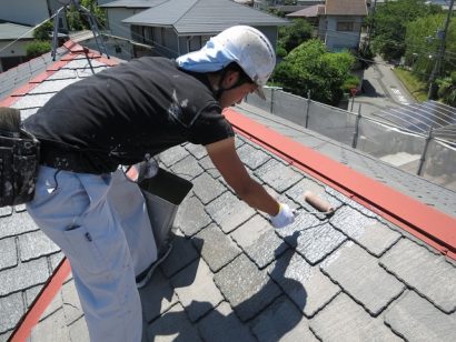 最後に上塗りをすれば完成! 施工前と完成後の写真を見比べてみてください。 これぞ職人技! ひび割れ補修箇所もわからないぐらい 美しく屋根がよみがえりましたよ♪
