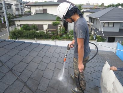 A様からのご依頼は 屋根塗り替えですが 外壁の汚れもていねいに落としていきますよ。