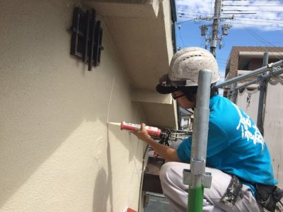 ひび割れ箇所を放置したままでいると 雨漏りの原因になったり 外壁内部に水がまわってしまったりで 大変困ったことになるおそれがあるので コーキングでていねいに補修していきます!