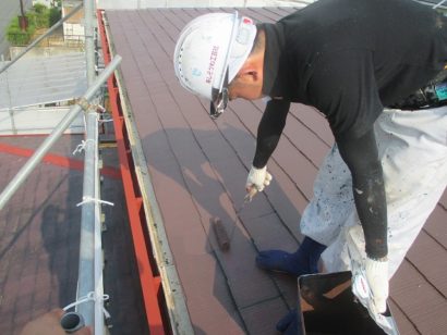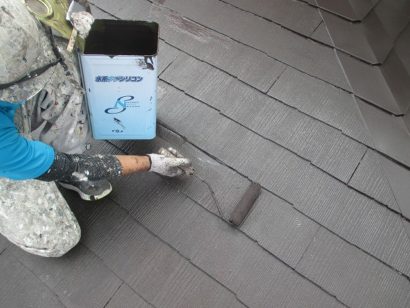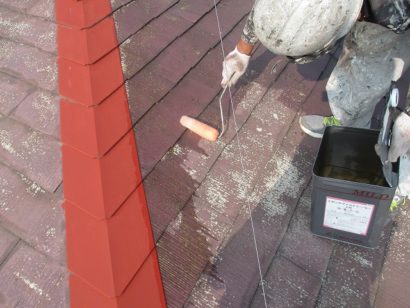 屋根も外壁と同様 たっぷりと下塗り剤を塗っていきます。