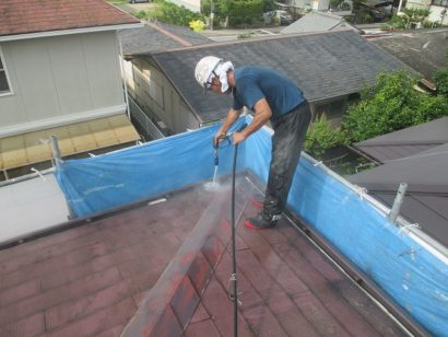 下地づくりの基本の基本となる 高圧洗浄作業ていねいに汚れを落としていきます。