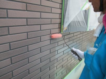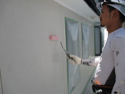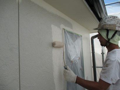 2階外壁 下塗り、中塗りを終え 仕上げの上塗りをしていきます。