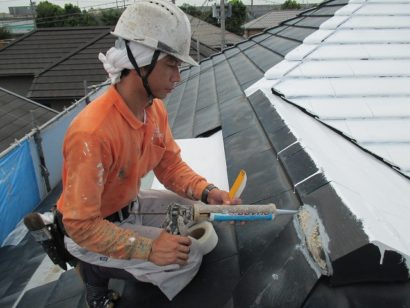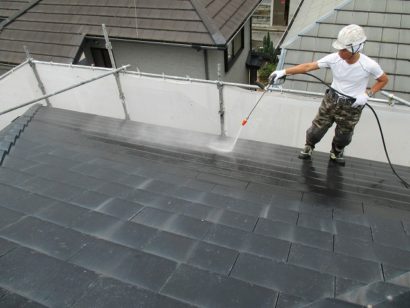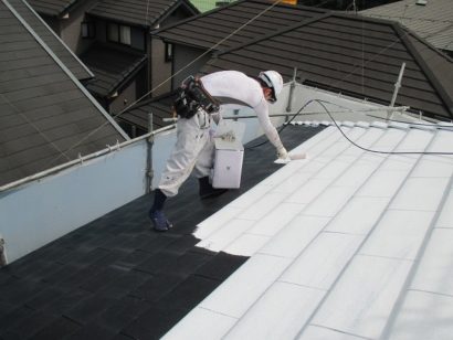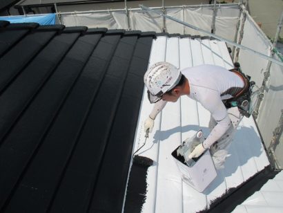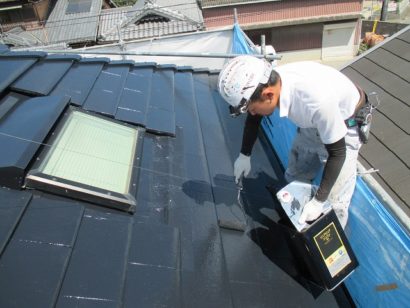 外壁と同様 塗料の密着性を高めるため 屋根も下塗り剤をたっぷりと塗っていきます!