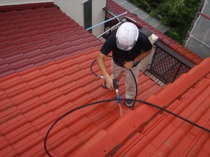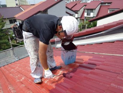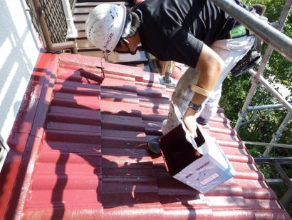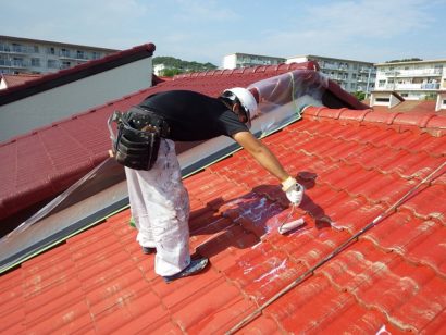 外壁と同様 塗料の密着性を高めるため 屋根も下塗り剤をたっぷりと塗っていきます!