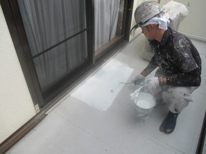 ベランダ防水下塗り~中塗り ベランダ防水に使用する塗料は なんとも強烈なニオイですが。。。職人さんはそんなことものともせず。。。 黙々とぬりすすめていきますよ!