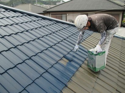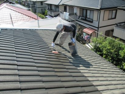外壁と同様 塗料の密着性を高めるため 屋根も下塗り剤をたっぷりと塗っていきます!