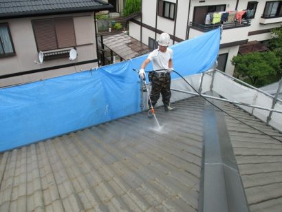 外壁と同様 屋根も高圧洗浄していきます。 その際 ひび割れ箇所などがないか確認しながら作業をすすめていきます!