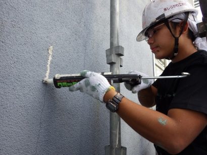 ひび割れ箇所を放置したままでいると 雨漏りの原因になったり 外壁内部に水がまわって塗料が浮いてしまうなど 大変困ったことになるおそれがあるので コーキングでていねいに補修していきます!