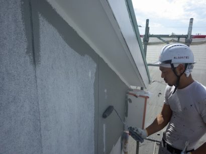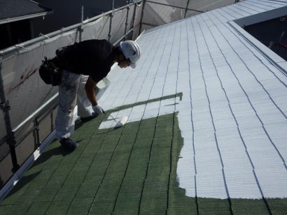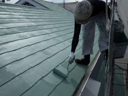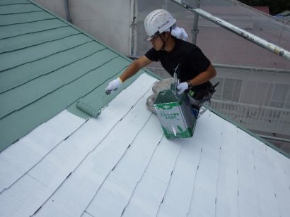 屋根も外壁と同様 たっぷりと下塗り剤を塗っていきます。