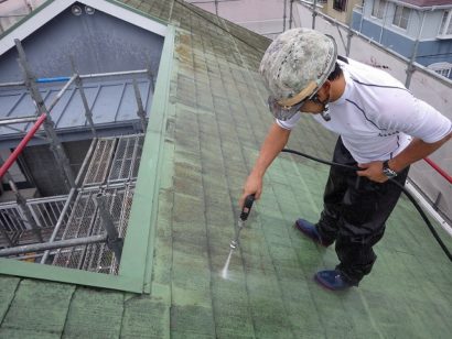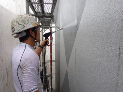 下地づくりの基本の基本となる 高圧洗浄作業ていねいに汚れを落としていきます。