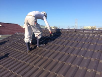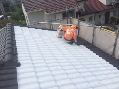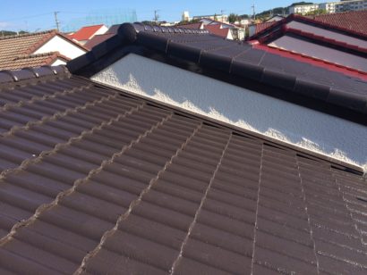 上塗りまで終えた屋根は 太陽の光を浴びて