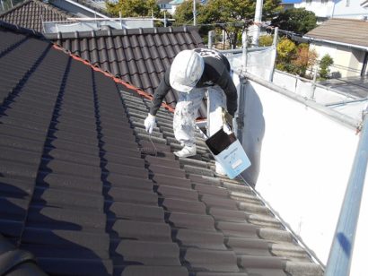 屋根も外壁と同様 たっぷりと下塗り剤を塗っていきます。