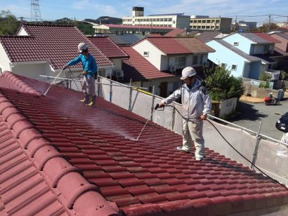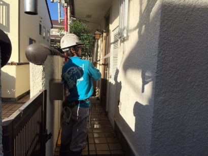 汚れが残ったまま塗装してしまうと、塗料の密着性が悪くなり耐久性も悪くなるおそれがあるので、汚れやチョーキングをきれいに洗い流していきます。