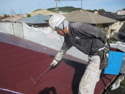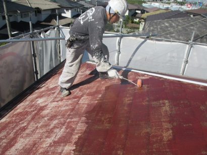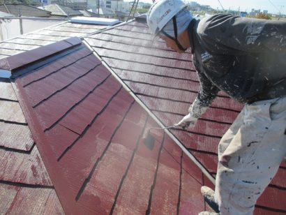 外壁と同様 塗料の密着性を高めるため 屋根も下塗り剤をたっぷりと塗っていきます!