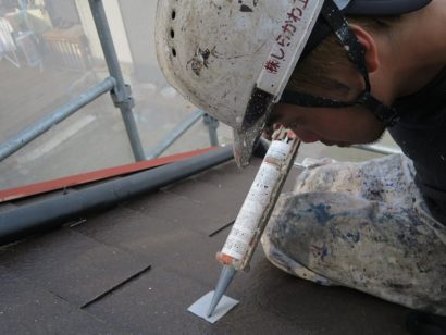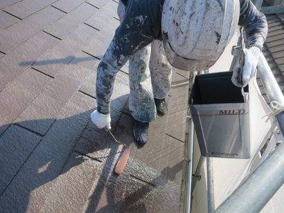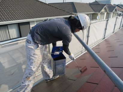 屋根も外壁と同様 たっぷりと下塗り剤を塗っていきます。