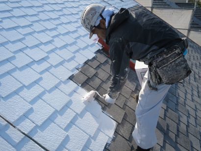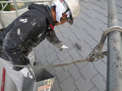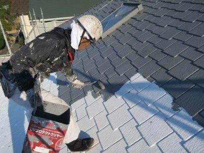 最後に上塗りをすれば完成! しっかりとした膜厚をつくりました~ 施工前と完成後の写真を見比べてみてください。これぞ職人技! ひび割れ補修箇所もわからないぐらい 美しく屋根がよみがえりましたよ♪