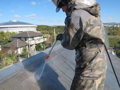 ひび割れ箇所などがないかを確認しながら 作業をすすめております! ボロボロになってしまった塗膜は 高圧洗浄で剥がせるかぎり剥がしていきますよ!